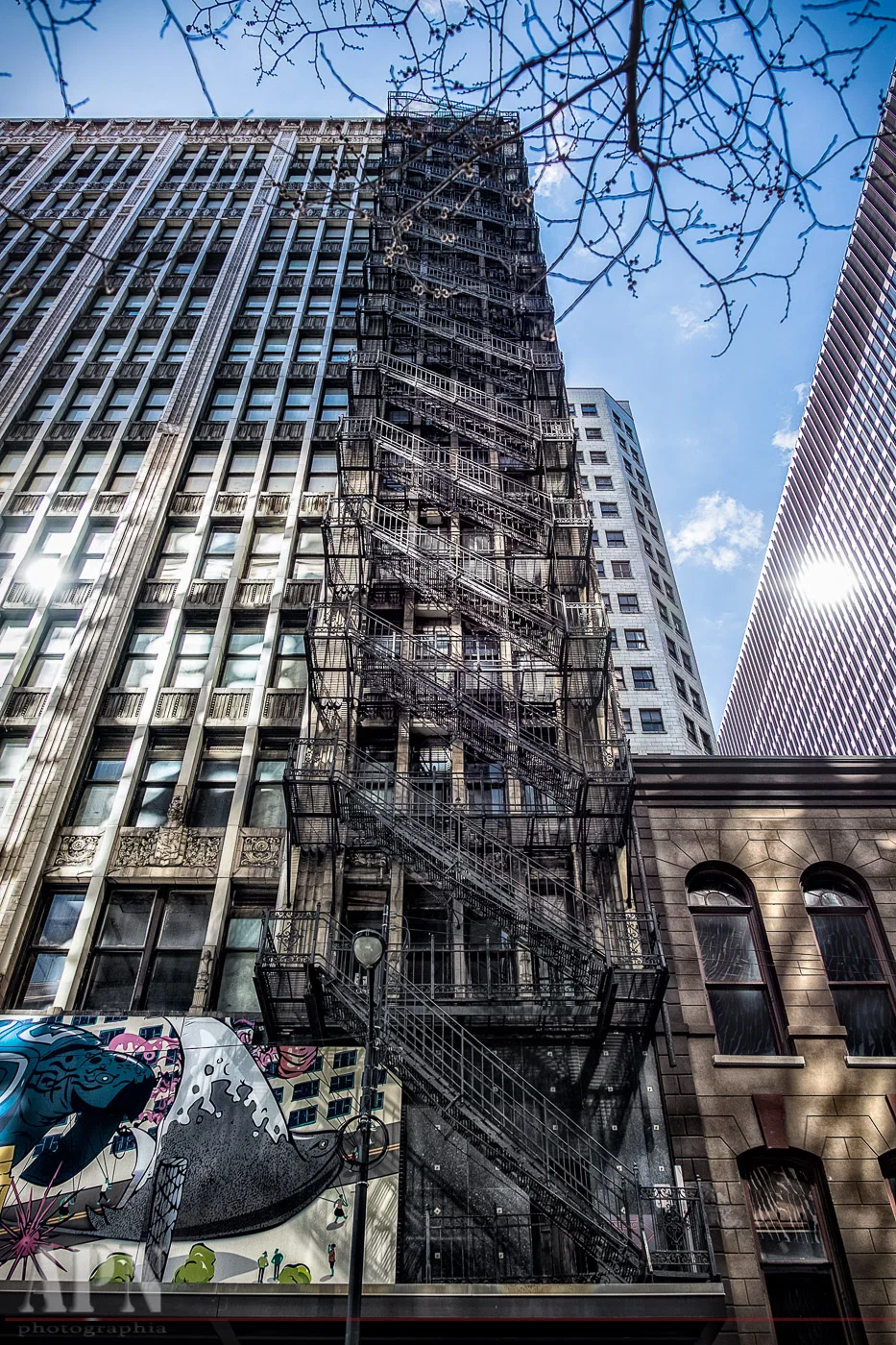 External fire escape stairs always fascinated me, maybe because they are such an uncommon sight in european architecture. So when I was in the US I took lots of photos of early 20th century buildings with external metal staircases. This example is from Chicago city center.